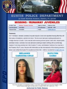 Corsi was reported as missing/runaway late last year. Corsi and Melianis Cardona-Cruz, age unavailable, were last seen walking eastbound on Orange Avenue in Eustis Nov. 30, 2024. If you have information on Cardona-Cruz’ whereabouts, call Eustis Police Department at 352-483-5400.