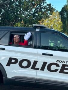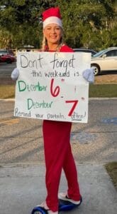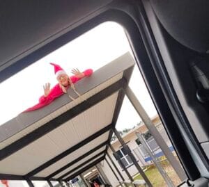 This year Boardway decided to play elf beginning Dec. 1 and through the last day of school before the break – Dec. 19, which means she’s been dreaming up new surprises for her students. She’s been spotted on the school’s sign, in a tree, and even detained in the back of a police SUV when the school resource officer busted her for her “elfish ways and unauthorized shenanigans.” She welcomes ideas from our readers who want to join in the fun, she told Inside Lake. Drop a comment on our Facebook page if you have an idea for Elf Boardway.